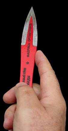 Понятно, что здесь показано положение ножа в момент вылета из руки, а начальное положение ножа вовсе не обязательно строго горизонтальное, а зависит от глубины замаха так, что если замах из-за головы, то при этом клинок оказывается обращенным к мишени и делается полный оборот. Таким образом вся техника такого броска сводится к точно заданному моменту вращения и поэтому она осваивается легче.