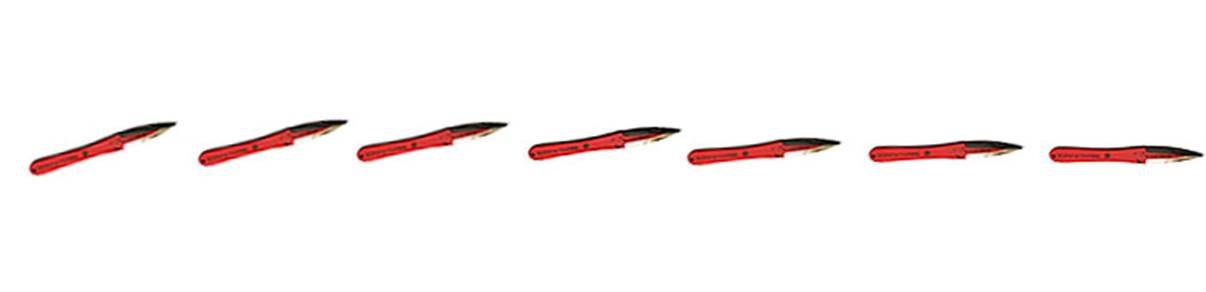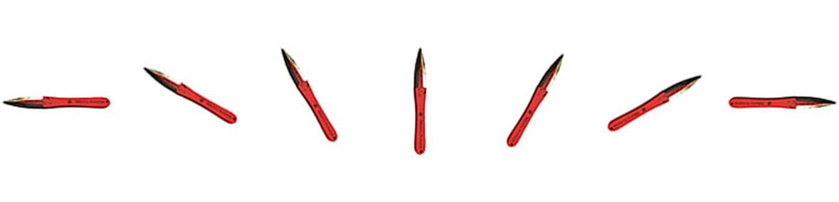 На схеме - вылет слева направо: нож вылетает еще не ориентированным точно к мишени и слегка докручивается в полете. Момент докрутки задается компенсирующим движением кисти при броске в зависимости от расстояния до мишени и особенностей броска (вертикальный из-за плеча или боковой, или другие особенности), как если бы мы хотели выпустить нож не острием вперед, а направленным несколько вверх и летящим ребром вперед, но наклон ребра нужно подбирать в зависимости от расстояния: на близкой дистанции - без наклона, прямо острием, на большей - с наклоном. Иначе трудно обеспечить точный момент вылета и полет острия строго вперед. Т.е. момент вылета на большой дистанции происходит не прямо напротив мишени, а чуть раньше.