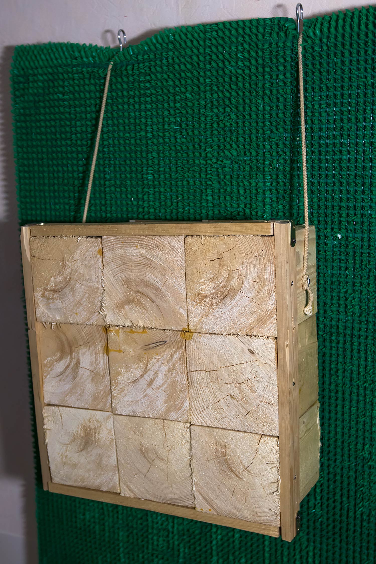 Но для квартиры это - слишком громоздко. Я сделал мишень из 9 брусков балки размером каждый в 15х15x20см. Получилась не очень большая, но удобная мишень, которую я вешаю на дополнительный защищающий стенку щит: