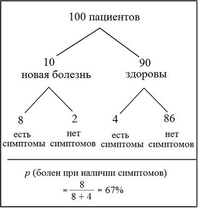Например, врачи наблюдали 100 пациентов, у 10 из которых была обнаружена новая болезнь (рис. 1). Из этих 10 у 8 есть симптомы болезни, но у 4 из не признанных больными также имеются эти симптомы. Разделение этих 100 случаев на 4 группы (болезнь и симптомы – 8, болезнь при отсутствии симптомов – 2, нет болезни при наличии симптомов – 4, нет болезни и нет симптомов – 86) дает значение 4 естественных частот: 8, 2, 4 и 86.