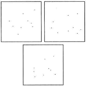 В конечном счете эта путаница может привести и кое к чему похуже: к ложным воспоминаниям. Первые научные свидетельства, показывающие подверженность человека ложным воспоминаниям, появились в ныне широко известном исследовании. Человека просили запомнить несколько изображений со случайно расположенными точками, как на следующих рисунках: