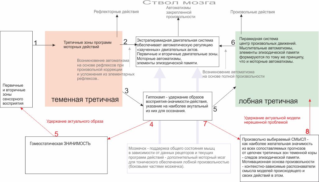 Фактически весь мозг, включая первичные зоны восприятия и первичные зоны действия оказывается включенным в систему осознанной произвольности необходимого уровня вовлеченности.