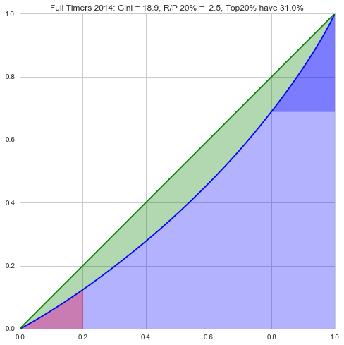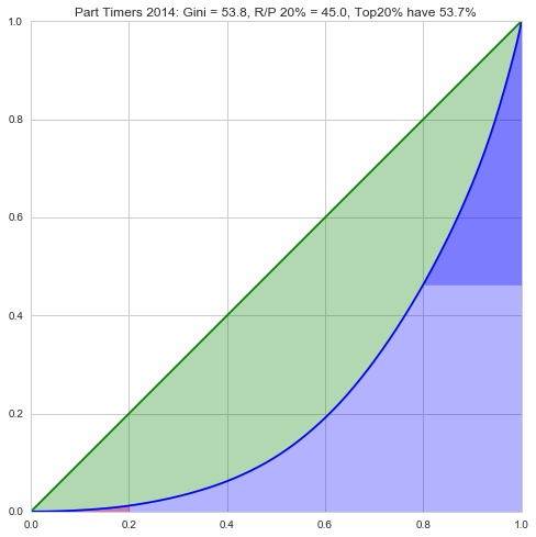 Мы видим разительное отличие от предыдущего графика. Дуга кривой Лоренца прогнулась далеко вниз, зеленая область увеличилась в размерах. Богатый треугольник занимает почти половину высоты, а бедный треугольник почти не видно. Индекс Джини составляет 53.6, а R/P 20 равен 45. Это примерно соответствует бедным странам Южной Америки, с ярко выраженным расслоением на зажиточных капиталистов и простоватых мучачос.