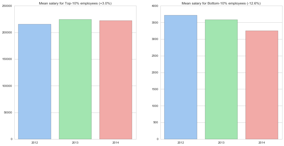Теперь давайте построим графики среднего дохода высшего и низшего децилей (10% самых больших и самых маленьких зарплат). Как видно, средний доход в высшем дециле увеличился на +3,0%, в то время, как доход в низшем дециле существенно упал на -12,6%.