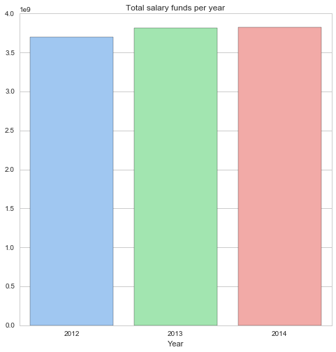 На рисунке ниже вы видите суммарный размер фонда оплаты труда муниципалитета Сан-Франциско за 3 года. Он вырос c $3,70 млрд в 2012ом году до $3.82 млрд в 2014ом, показав рост +3,2% общего объема.