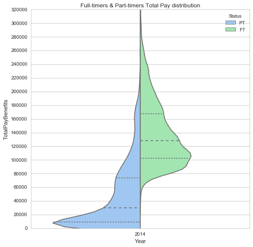 Сан-Франциско — недешевый город. Официальная минимальная зарплата составляет порядка $20.000 в год, субъективный прожиточный минимум — от $40.000 в год. Непонятно, откуда же такое большое число людей с зарплатой меньше МРОТ? Ответ кроется в признаке Status — FT (Full-time) и PT (Part-time), т.е. в выборке есть не только штатные сотрудники, но и совместители, в т.ч. разовые подработки. Признак Status проставлен только для 2014го года.