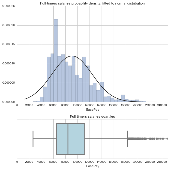 На верхнем рисунке вы видите попытку подогнать распределение зарплат к нормальному. Наибольшему значению плотности распределения соответствует средняя зарплата, которая составляет $90.000. На нижнем рисунке изображены квартили распределения зарплат, средняя линия внутри прямоугольника — медианная зарплата, и она составляет $85.000. Как видим, действительно, средняя зарплата выше медианной, но отнюдь не существенно.
