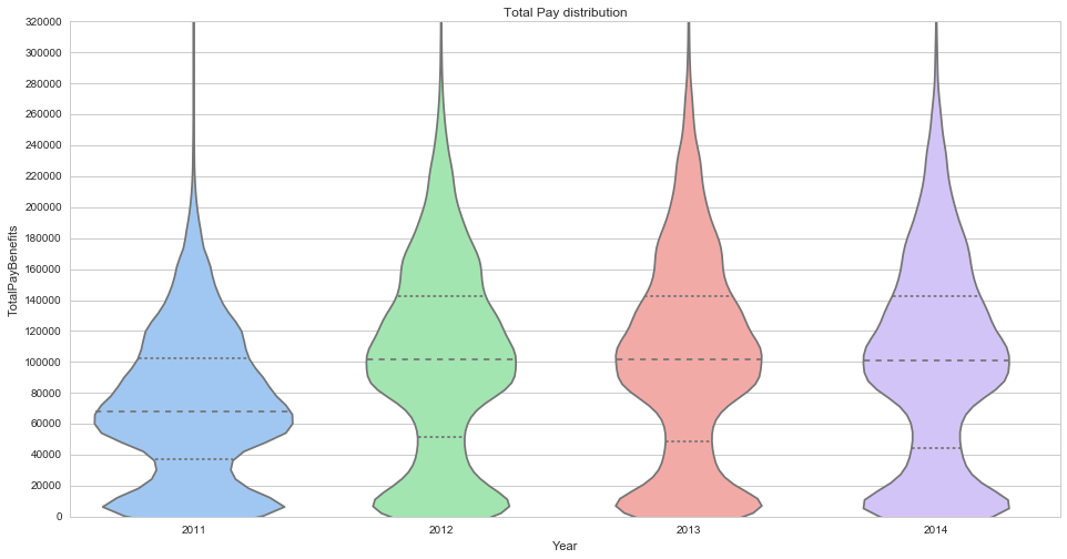 Эти четыре… гхм… “морковки” символизируют распределение доходов за 4 года. По оси Y — величина дохода, по оси X — плотность вероятности распределения доходов. Поперечные пунктирные линии — это квартили 25%, 50% (медиана) и 75% распределения. Четко видно несколько уплотнений — в районе $5.000, $65.000, $110.000 и $170.000. Так выглядят классы сотрудников — временные рабочие, линейный персонал, высококлассные специалисты и топ-менеджмент. Кажется, что “морковка” медленно едет вверх, что может означать как растущий уровень благосостояния, так и инфляцию.
