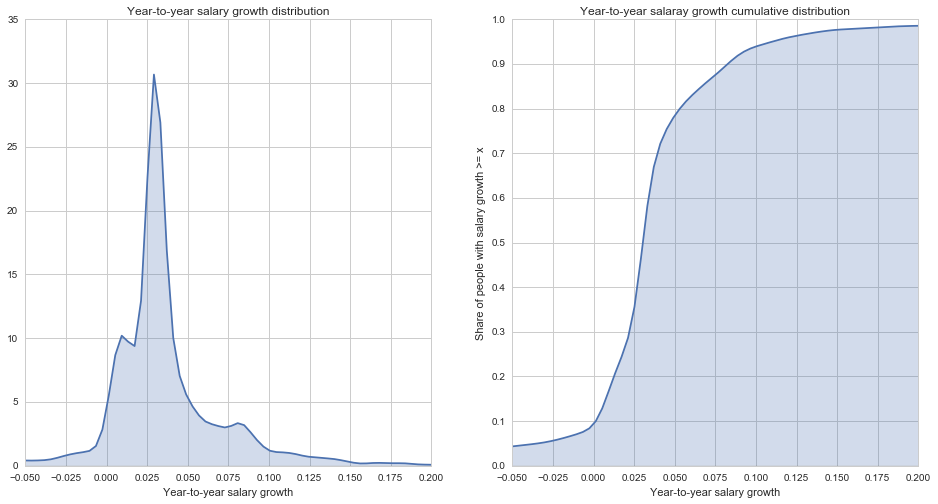Слева изображен график плотности вероятности роста дохода, справа — график функции распределения роста дохода. Во-первых, видно, что рост доходов 20% сотрудников лежит в диапазоне от 0 до 2%, что примерно покрывает инфляцию. Наиболее распространенный рост доходов — от 2% до 5%, он наблюдается в 50% случаев, это мода скорости карьерного роста. Далее, примерно 15% людей смогли добиться роста в 5-10%, такой темп роста можно считать высоким. И не более 5% людей показали выдающийся рост доходов более чем на 10% год к году. Стоит также отметить, что 10% сотрудников показали отрицательный рост дохода, т.е. их зарплаты уменьшались год к году.