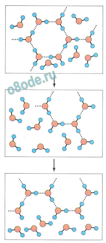Когда лёд плавится, его тетрагональная структура разрушается и образуется смесь полимеров, состоящая из три-, тетра-, пента-, и гексамеров воды и свободных молекул воды. Схематически этот процесс показан ниже.