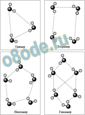 строение три-, тетра-, пента-, и гексамера воды. Все они цикличны,