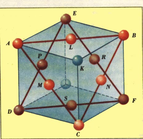 Рис.1 Можно с одинаковым основанием считать эту фигуру усеченным кубом или октаэдром. Бакминстер Фуллер, обнаруживший этот многогранник, считал, что он является величайшей из всех форм творения. Для него этот многогранник был так важен, что он присвоил ему совершенно новое имя - векторное равновесие. Ниже мы увидим, что такое название чрезвычайно актуально, т.к. свойства всех кристаллов будут определяться именно их внутренними векторными свойствами. Он открыл, что эта форма, через разные формы вращения, превращается во все пять Платоновых тел. Кажется, что эта форма содержит их все внутри себя. Двойником кубоктаэдра является ромбододэкаэдр, который получается путем соединения центров кубоктаэдра (и наоборот). Д. Мельхиседек пишет об этом следующим образом (т.1, стр. 194): "Я думаю, что первые пять Платоновых тел - это первые пять нот пентатоники. В октаве 7 нот, последние две относятся к кубоктаэдру и ромбодекаэдру". Видимо, не будет преувеличением сказать, что и остальные пять дополнительных монадных форм, которые образуют целостную хроматическую монадную гамму многогранников, и будут содержать в качестве граней только треугольники и (или) квадраты. Следовательно, мир кристаллов сложен из треугольных, или квадратных граней. О мире кристаллов написано много замечательных книг. И это не удивительно. Мир кристаллов вездесущ. Он также, как и мир волн, пронизывает все явления нашей жизни. Этот мир целиком и полностью соткан из мира симметрии и асимметрии. Он проявляется себя в живой и неживой материи. Мир элементарных частиц, атомы химических элементов, молекулы, минералы, флора и фауна планеты-все это кристаллические структуры. Так, например, в мире органической химии можно вспомнить о молекуле бензоле (С6H6). Атомы углерода располагаются в одной плоскости, образуя правильный шестиугольник.