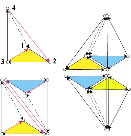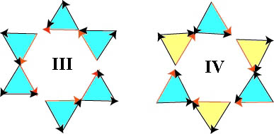 рис. 8 Цифры 1 и 2 также характеризуют эти формы, как имеющие разную спиральность и показывающие, как из триангул формируется корпускула (битриангула). Из рисунка видно два типа триангул. Одна триангула полностью замкнута, в то время как в другой замыкание осуществляется вектором, являющимся сумой двух других векторов. Эти вектора на рисунке обозначены красным цветом. Такие триангулы будем считать "заряженными". Конечно, это не единственный способ формирования корпускул из триангул. Рисунок характеризует только принципы формирования корпускул из триангул. Но эти принципы являются универсальными, всеобщими. Приведем теперь пример корпускуляров, сформированных из корпускул. Тогда, соединяя битриангулы III и IV через вершины, мы получим![]()