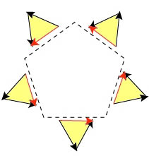 рис. 10 Однако эти цветки не формируют целостную систему, замкнутую оболочку. Триангулы отделены друг от друга корпускулами, а сформированная ими внутренняя силовая линия оказывается замкнутой. Поэтому они могут вращаться вокруг центрального "цветка". Ниже мы покажем, что такой тип оболочки присутствует в целостном монадном Цветке Жизни. Возможно, что в мире элементарных частиц эти монадные оболочки могут быть родоначальниками лептонного семейства. Существование векторов устремлений, имеющих противоположную направленность (и спиральность, позволяет ввести в рассмотрение положительные и отрицательные векторы (положительные либо отрицательные стрелы оптимальности). Например, можно говорить, что векторы устремлений, характеризующие эволюцию двойственной пары "сфера-куб" можно называть вектором, имеющим отрицательный заряд, в то время как вектор устремлений пары "куб-сфера" могут характеризоваться положительным зарядом. В каждой точке любой монадной формы можно определить свой собственный вектор устремлений, который будет однозначно характеризовать местоположение, собственное значение "веса" этой точки и ориентацию его в пространстве. Любая заряженная монадная форма имеет свою собственную стрелу оптимальности. Любая незаряженная монадная форма также имеет собственную стрелу оптимальности. В последнем случае стрела оптимальности будет характеризовать ось вращения (ось симметрии) уравновешенной монадой формы. Стрела оптимальности в разных научных приложениях может иметь разный смысл (мировая линия, спин, ось вращения, ось симметрии, и т.д.). Хочется отметить в этом направлении работы Бишкекской группы независимых ученых (подробнее), в работах которых на серьезном научном уровне обосновываются приоритеты асимметрии нашего мира и вводится понятие стрелы оптимальности. Но вот проблема взаимодействия стрел оптимальности, проблема того, как из асимметрии рождается симметрия, к сожалению, остается за "кадром" в оригинальных трудах этой группы ученых. Оказывается, что природа знает основы философии. Она знает закон отрицания отрицания, в соответствии с которым стрела оптимальности периодически меняет свое направление на противоположное, сменяя тезис на антитезис. Рассмотрим некоторые дополнительные свойства векторов устремлений.