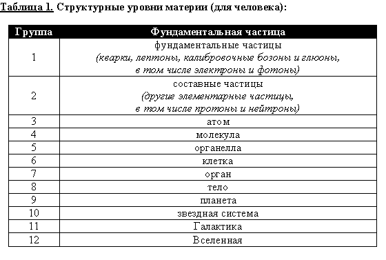 Рассмотрим теперь все существующие структурные уровни материи (см. таблицу 1), определяющие структуру веществ, структуру биологических форм и структуру космических образований.