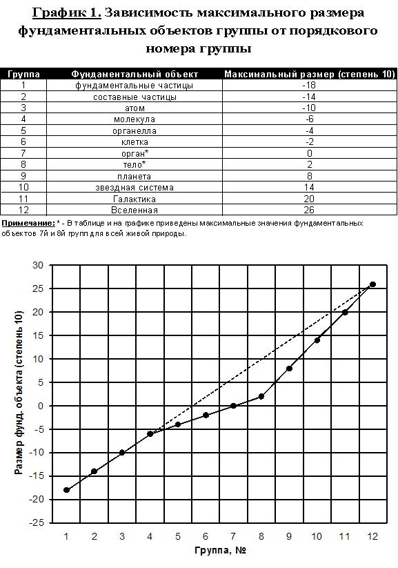 Идея связи структурных уровней материи с принципами построения нашего мироздания оказывается всегда лежала у нас на виду. Убедиться в этом можно, взглянув на удивительный график, на котором соответствующие группам вершины лежат на трех прямых отрезках (см. график 1). Тот факт, что отрезка три тоже не случаен. Дело в том, что всего можно выделить три типа параллельных миров, как и два соответствующих им класса аспектов психики человека.