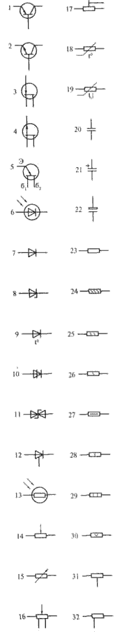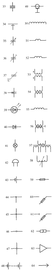 1- транзистор структуры р- n-р в корпусе, общее обозначение 2- транзистор структуры п-р-п в корпусе, общее обозначение 3 - транзистор полевой с p-n-переходом и п каналом 4 - транзистор полевой с p-n-переходом и р каналом 5 - транзистор однопереходный с базой п типа, б1, б2 — выводы базы, э — вывод эмиттера 6 - фотодиод 7 - диод выпрямительный 8 - стабилитрон (диод лавинный выпрямительный) односторонний 9 - диод тепло-электрический 10 - тиристор диодный, стираемый в обратном направлении 11 - стабилитрон (диодолавинный выпрямительный) с двусторонней проводимостью 12 - тиристор триодный 13 - фоторезистор 14 - переменный резистор, реостат, общее обозначение 15 - переменный резистор 16 - переменный резистор с отводами 17 - построечный резистор-потенциометр 18 - терморезистор с положительным температурным коэффициентом прямого нагрева (подогрева) 19 - варистор 20 - конденсатор постоянной емкости, общее обозначение 21 - конденсатор постоянной емкости поляризованный 22 - конденсатор оксидный поляризованный электролитический, общее обозначение 23 - резистор постоянный, общее обозначение 24 - резистор постоянный с номинальной мощностью 0, 05 Вт 25 - резистор постоянный с номинальной мощностью 0, 125 Вт 26 - резистор постоянный с номинальной мощностью 0, 25 Вт 27 - резистор постоянный с номинальной мощностью 0, 5 Вт 28 - резистор постоянный с номинальной мощностью 1 Вт 29 - резистор постоянный с номинальной мощностью рассеяния 2 Вт 30 - резистор постоянный с номинальной мощностью рассеяния 5 Вт 31 - резистор постоянный с одним симметричным дополнительным отводом 32 - резистор постоянный с одним несимметричным дополнительным отводом 33 - конденсатор оксидный неполяризованный 34 - конденсатор проходной (дуга обозначает корпус, внешний элекрод) 35 - конденсатор переменной емкости (стрелка обозначает ротор) 36 - конденсатор подстроечный, общее обозначение 37 - варикап 38 - конденсатор помехоподавляющий 39 - светодиод 40 - туннельный диод 41 - лампа накаливания осветительная и сигнальная 42 - звонок электрический 43 - элемент гальванический или аккумуляторный 44 - линия электрической связи с одним ответвлением 45 - линия электрической связи с двумя ответвлениями 46 - группа проводов, подключенных к одной точке электрическою соединения. Два провода 47 - четыре провода, подключенных к одной точке электрическою соединения 48 - батарея из гальванических элементов или батарея аккумуляторная 49 - кабель коаксиальный. Экран соединен с корпусом 50 - обмотка трансформатора, автотрансформатора, дросселя, магнитного усилителя 51 - рабочая обмотка магнитного усилителя 52 - управляющая обмотка магнитного усилителя 53 - трансформатор без сердечника (магнитопровода) с постоянной связью (точками обозначены начала обмоток) 54 - трансформатор с магнитодиэлектрическим сердечником 55 - катушка индуктивности, дроссель без магнитопровода 56 - трансформатор однофазный с ферромагнитным магнитопроводом и экраном между обмотками 57 - трансформатор однофазный трехобмоточный с ферромагнитным магнитопроводом с отводом во вторичной обмотке 58 - автотрансформатор однофазный с регулированием напряжения 59 - предохранитель 60 - предохранитель выключатель 61 - предохранитель-разъединитель 62 - соединение контактное разъемное 63 - усилитель (направление передачи сигнала указывает вершина треугольника на горизонтальной линии связи) 64 - штырь разъем
