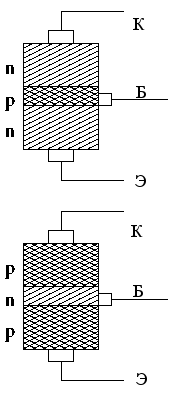 Биполярный транзистор — трёхэлектродный полупроводниковый прибор, один из типов транзистора. Электроды подключены к трём последовательно расположенным слоям полупроводника с чередующимся типом примесной проводимости. По этому способу чередования различают npn и pnp транзисторы (n (negative) — электронный тип примесной проводимости, p (positive) — дырочный). В биполярном транзисторе, в отличие от других разновидностей, основными носителями являются и электроны, и дырки (от слова «би» — «два»). Схематическое устройство транзистора показано на втором рисунке.
