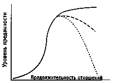 Поначалу преданность увеличивается медленно, а затем - быстрее, по мере развития отношений. В конечном счете на определенном уровне она стабилизируется, если отношения становятся постоянными, или возвращается к исходной точке, если отношения прекращаются.