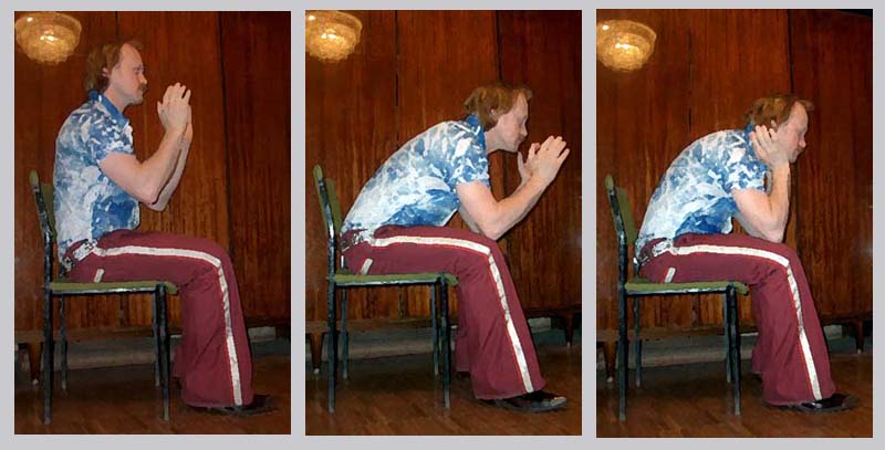 горбясь, поставив локти на колени. Я попытался сесть так же (не горбясь) и