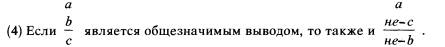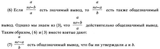 Правило (5) может быть получено, например, из правила (4) вместе с законом двойного отрицания, согласно которому из не-не-b можно вывести b. Однако если (5) значимо для любого высказывания а, b, с (и значимо только при этом условии), тогда оно должно быть значимо и в том случае, если с окажется тождественно а', иными словами, должно быть значимо следующее: