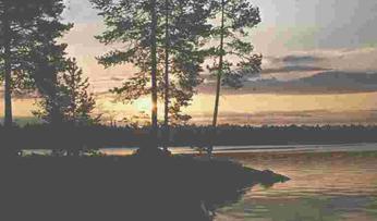 Впервые мы причалили к этому острову, укрываясь от материкового ветра, и заночевали, а утром, пораженные тихой его прелестью, единодушно решили постоять, несколько дней. В мелкой, с белым кварцеым песком, лагуне на южном берегу, мы выловили целую рощу почерневшего топляка, сложили его штабелем на мыске для просушки под неярким, но упорным приполярным солнцем, и сами, отвлекаясь только на хозяйственные несложные хлопоты, загорали на косе, постелив спальные мешки на почти газонную траву между нескольких вековых сосен. Утром куропатка выводила на водопой свою суетливую, но послушную семейку, и они мимо нас спускались к воде, а потом уходили куда-то в заросли. Во второй бухте, слева от косы, из тростника важно выплывала утка со своим выводком.. И на совсем уж миниатюрном островке в конце косы, между четырьмя карликовыми березами и сосенками, жадно уцепившимися за жалкую почву, было гнездо чайки, и детеныш, неловко ковыляя и путаясь в непослушных крыльях, спускался попить, шелестел в траве и поднимался обратно.