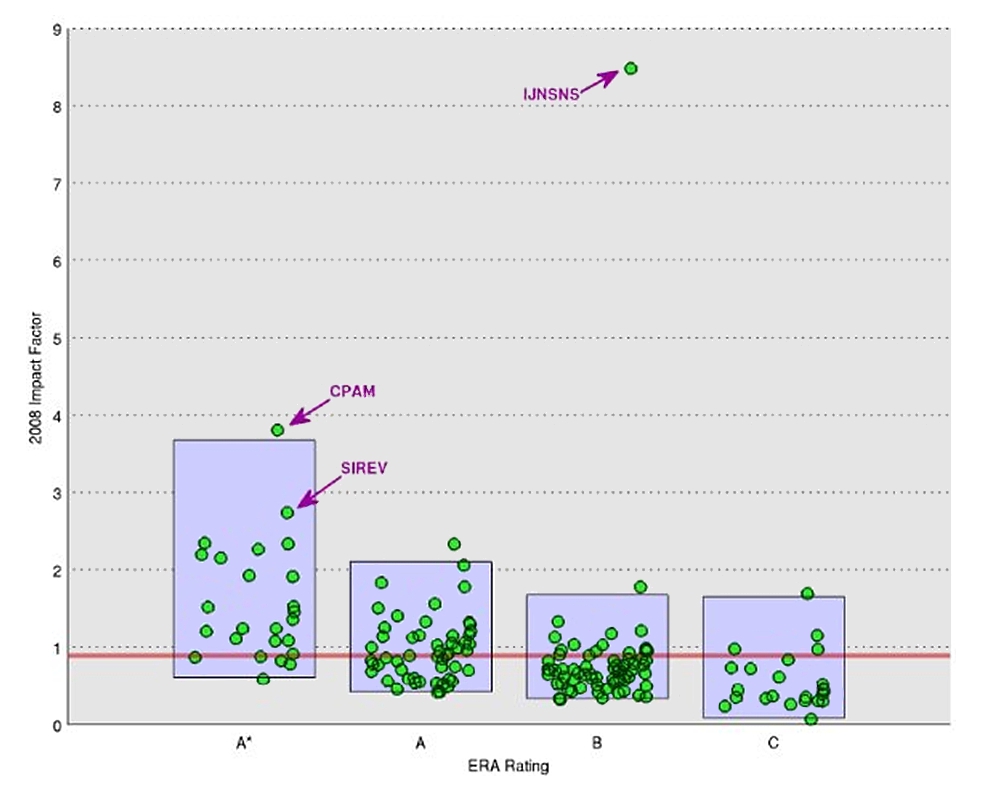 Мы видим, что импакт-фактор слабо соответствует оценке экспертов. Имеется много примеров журналов с более высокими значениями импакт-фактора, чем у других журналов, занимающих в рейтинге позиции на один, два и даже на три уровня выше. Под красной линией находится 20% журналов уровня A*; примечательно, что более высокое значение импакт-фактора имеют 51% журналов уровня A, 23% журналов уровня B и даже 17% журналов уровня C. Самый экстремальный выброс демонстрирует IJNSNS, который, несмотря на относительно огромное значение импакт-фактора, находится не на первом или втором, а скорее на третьем уровне рейтинга. В рейтинге ERA наивысшую оценку A* получили 25 журналов. В этой группе представлено большинство журналов с наивысшими значениями импакт-фактора, включая CPAM и SIREV, но из 10 журналов с наивысшими значениями импакт-фактора два получили оценку A, и только IJNSNS попал в группу B. Всего имелось 53 журнала с рейтингом A и 69 журналов с рейтингом B. Если допустить, что IJNSNS является лучшим среди журналов группы B, то имелось бы 78 журналов с более высоким рейтингом ERA; если же он был бы худшим, то его рейтинг упал бы до 147. Коротко говоря, рейтинг ERA показывает, что IJNSNS не только не является лучшим журналом в области прикладной математики, но что его рейтинг находится где-то в диапазоне 75-150. Это удивительное несоответствие между репутацией журнала и его импакт-фактором нуждается в разъяснении.