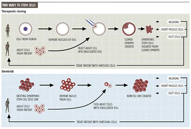 Из стволовых клеток удаляется ядро, содержащее ДНК; затем у взрослых берутся клетки и сливаются со стволовыми. Идея состоит в том, что цитоплазма эмбриональной стволовой клетки перепрограммирует ДНК взрослой клетки, преобразуя её в точно такую же стволовую.