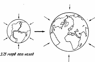 Рис. 22.1. Расширение Земли вследствие поглощения ею эфира космического пространства. Скорость втекания эфира в Землю равна второй космической скорости и составляет 11,18 км/с