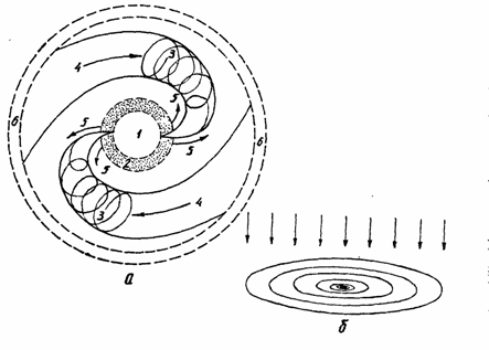 а - кругооборот эфира; б - обдув Солнечной системы потоком эфира; 1 - ядро Галактики - центр вихреобразования и формирования протонов; 2 - область образования звезд из протонного газа; 3 - потоки эфира, текущие от периферии Галактики к центру (проявляются в виде магнитного поля спиральных рукавов Галактики); 4 - общее направление смещения эфира от периферии Галактики к ее ядру; 5 - общее направление потока заезд от ядра Галактики к ее периферии; 6 - область распада вещества в свободный эфир