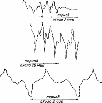 В космосе существуют и другие эфирные потоки. Проводя эксперимент с отклонением лазерного луча под воздействием эфирного ветра и действительно получив суточную вариацию отклонения под влиянием какого-то воздействия (возможно, что и суточной вариации температуры), автор настоящей статьи неожиданно обнаружил относительно регулярные колебания лазерного луча. Колебания имели повторяющуюся форму, вторая гармоника в них явно выражена (рис. 22.4). Если амплитуда колебаний менялась в относительно небольших пределах - в 2-3 раза, то период менялся в весьма широких пределах - от единиц минут до часа и даже более. У автора создалось впечатление об "обстреле" Земли тороидальными вихрями или цугом линейных вихрей типа "дорожки Кармана". Несомненно, что это явление заслуживает того, чтобы разобраться в нем детальнее.