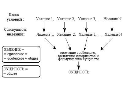 Познание сущности идет от явлений, путем отсечения второстепенного, особенного, к выделению общего, т.е. того, что остается неизменным для всех явлений данной совокупности. Сущность как общее для всех явлений отражает глубинные связи и отношения. Процесс поиска сущности сложен и нет каких-либо рецептов для прямого перехода от явлений к сущ-