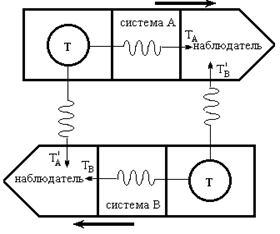 Смысл его очевиден. Собственное время во всех инерциальных системах отсчета едино, т.е. течет в одном ритме, темпе (ТА= TВ). Явления обладают симметрией (Т'A= Т'B; ТА< Т'A; TВ < T'B). Это и есть реализация принципа равноправия инерциальных систем отсчета.
