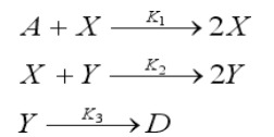 Очевидно, при обращении времени (t’=-t) и введении обозначений  для концентраций в зависимости от времени уравнение (1) принимает вид: