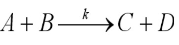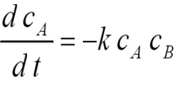 Эта ситуация удивительно ярко иллюстрируется на примере химической реакции. Рассмотрим процесс, описываемый уравнением . Скорость расходования частиц типа А пропорциональна частоте встреч молекул типов А и В, которая в случае разбавленных систем пропорциональна произведению их концентраций. Таким образом, имеем
