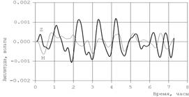 Фиг.3. Вертикальная Z и горизонтальная H компоненты записи колебания после землетрясения в Иране, 14.03.98, М = 6.9. Видно, что преобладают радиальные колебания над крутильными, имеющими горизонтальную ориентацию.