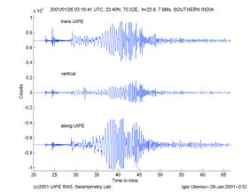 Фиг.4. Образец цифровой записи землетрясения в Индии, М=7.9, 26.01.2001, полученной на постоянно действующей широкополосной станции КСЭШ-Р.
