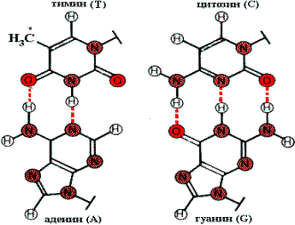 Комплементарные пары оснований. *СН3—группа в тимине (Т) замещается на H в урациле (U).