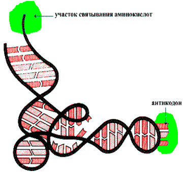 tRNA имеет на 3-—конце ССА для связывания аминокислоты, а в средней части молекулы — антикодоновый участок — последовательность нуклеотидов, обеспечивающую взаимодействие tRNA с кодоном mRNA.