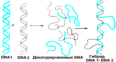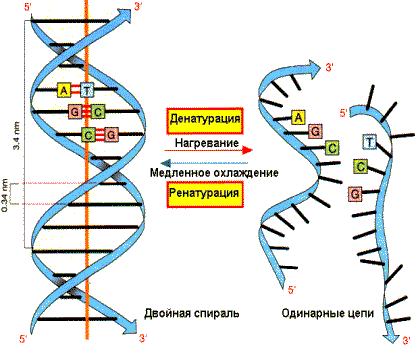 При денатурации двухспиральная молекула DNA разделяется на отдельные цепи. Температура, при которой 50% DNA денатурировано, называется температурой плавления и зависит от качественного состава DNA. Так как пары G—C стабилизированы тремя водородными связями, а пары А—Т только двумя, то чем выше доля G—C пар, тем стабильнее молекула. При денатурации DNA поглощение света при длине волны 260 нм повышается (гиперхромный эффект), что позволяет легко контролировать состояние вторичной структуры DNA. Если раствор денатурированной DNA медленно охлаждать (отжиг), то вновь возникают слабые связи между комплементарными цепями и может получиться спиральная структура, идентичная исходной (нативной). На способности DNA к денатурации и ренатурации основан метод молекулярной гибридизации, который применяют для изучения строения нуклеиновых кислот. Препараты DNA, выделенные из особей, принадлежащих к разным видам, образуют несовершенные гибриды. Спиральная структура получается не по всей длине молекулы. В неспирализированных участках полинуклеотидные цепи не комплементарны друг другу. Следовательно, DNA особей неидентична.
