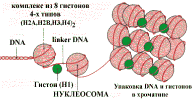 В состав хроматина входят DNA и гистоны — белки с высоким содержанием лизина и аргинина. Предполагается, что аминогруппы радикалов этих аминокислот взаимодействуют с кислотными группами DNA. Цепи DNA обвивают глобулу гистонов, образуя четковидную структуру нуклеосом, которые связаны между собой линкерной цепочкой DNA. В дальнейшем эти нуклеосомы упаковываются в крупные хроматиновые структуры, благодаря чему достигается компактная их укладка в хромосомах.