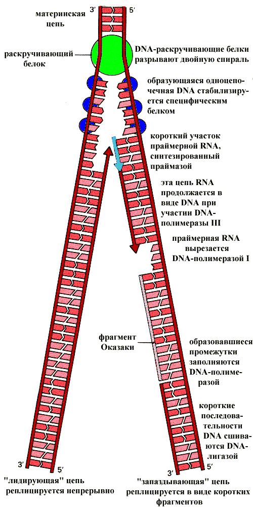 Субстратами синтеза являются дезоксинуклеозидтрифосфаты, выполняющие роль строительного материала и источников энергии. Для репликации DNA необходим большой набор разнообразных ферментов и белков — репликативный комплекс. Далее будет описана функция основных компонентов этого комплекса. Белки, раскручивающие спираль DNA, и белки, стабилизирующие разделенные нити DNA. В результате действия этих белков образуется репликативная вилка — участок DNA, в пределах которого спираль раскручена и разделена на отдельные цепи. DNA—полимераза обеспечивает включение в растущую Lновую¦ цепь нуклеотидов комплементарных Lстарой¦, то есть матричной цепи. DNA—полимераза не способна начинать синтез новой цепи с ее первого нуклеотида. Она может удлинять уже имеющуюся цепь, поэтому для начала реакции требуется затравка (праймер), которая представляет собой короткий полинуклеотид, комплементарный матричной цепи DNA. Фермент присоединяется к матричной цепи DNA и к праймеру в области3-—концевого нуклеотида праймера. Перемещаясь по матрице в направлении ее 5-—конца, DNA—полимераза удлиняет затравку, присоединяя к ней один за другим нуклеотиды. Одноцепочечная затравка — праймер синтезируется при участии DNA— зависимой RNA—полимеразы (праймазы). Синтез новых цепей DNA может протекать только в направлении 5- à 3-. Таким образом, на одной цепи DNA синтезируется непрерывно Lлидирующая¦ цепь, а на другой образуются короткие фрагменты— Lзапаздывающая¦ цепь. Затем последовательность праймера удаляется и образовавшийся промежуток заполняется с помощьюDNA—полимеразы.