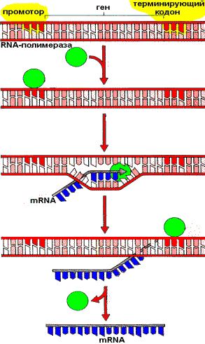Молекула DNA, хранящая генетическую информацию, непосредственного участия в синтезе белка не принимает, но с нее по мере необходимости считывается информация, то есть специфические участки DNA копируются (транскрибируются) в виде RNA с последующей трансляцией в полипептидную цепь белка. Транскрипция, как и репликация DNA, — эндоэргический процесс, сопряженный с использованием нуклеозидтрифосфатов в качестве субстратов и источников энергии.