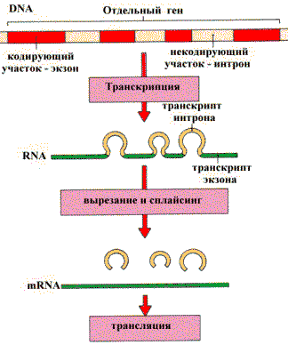 RNA—полимераза катализирует синтез всех типов RNA. Особенностью действия этого фермента является то, что он предварительно Lузнает¦ ту часть DNA, которую необходимо транскрибировать, и присоединяется к ней. Участок, с которым связывается RNA—полимераза, называется промотором. Последовательность оснований по ходу цепи DNA ниже сайта промотора с направлением 3- à 5- используется в качестве матрицы для синтеза RNA. Другая цепь остается нетранскрибируемой. RNA—полимераза вместе с растущей цепью RNA перемещается по матрице, пока не достигнет терминирующего кодона. В эукариотической DNA информация, необходимая для синтеза белка хранится на участках — экзонах, разделенных интронами — участками не содержащими генетической информации (некодирующие участки). При транскрипции гена сначала образуется первичный транскрипт, который затем подвергается Lдоработке¦ — процессингу. Суть доработки заключается в вырезании интронов (сплайсинг) из mRNA перед трансляцией и в присоединении характерных для mRNA концевых последовательностей.