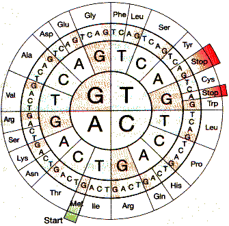 Биологический код (последовательность нуклеотидов кодона считывается от центра к периферии)