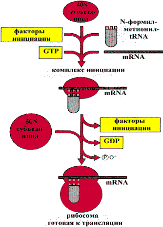 Инициация. До того как начнется синтез белка, формируется инициирующий комплекс, состоящий из малой и большой субъединиц рибосом, белковых факторов инициации и аминоацил — tRNA. Инициация запускается специфической последовательностью mRNA, содержащей кодон метионина. Элонгация. Большая субъединица рибосомы несет два рядом расположенных сайта связывания tRNA: один связывается с аминоацил —tRNA (сайт А), а другой — с пептидил — tRNA (сайт Р). Специфичность этих сайтов связывания определяется кодонами mRNA, комплементарными к антикодонам tRNA. Пептидильный остаток (или N—формилметионин на первой стадии) переносится на аминокислотный остаток tRNА, связанной с сайтом А, с образованием пептидил —tRNA в сайте А и Lпустой¦ (свободной) tRNA в сайте Р. Это формирование пептидной связи катализируется рибосомальной пептидилтрансферазой.