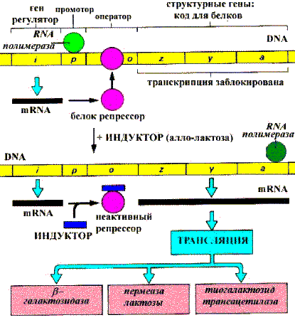 Транскрипция генов может подавляться или активироваться, следовательно, синтез белков может репрессироваться или индуцироваться. Оперон — это участок DNA, кодирующий строение, как правило, функционально связанных белков и содержащий регуляторную зону, контролирующую синтез этих белков. На рисунке приведена схема лактозного оперона: