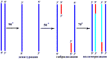 PCR осуществляют в пробирке с помощью термостабильной DNA—полимеразы (Tag—полимеразы) при участии дезоксинуклезидтрифосфатов — субстратов и коротких олигонуклеотидных затравок — праймеров. Праймер — это короткие, длиной в 20—30 нуклеотидов одноцепочечные фрагменты DNA, комплементарные 3-—концевым последовательностям копируемой DNA—матрицы. Благодаря праймерам ограничивается фрагмент DNA, который будет скопирован Tag—DNA—полимеразой, присоединяющейся к 3-—концам праймеров и достраивающей их до заданной длины. Реакция происходит в несколько стадий: