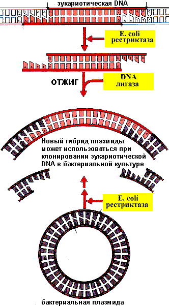 Фрагменты DNA можно вырезать из генома эукариот специально подобранными рестриктазами и встраивать в DNA плазмиды или вируса вскрытую (разрезанную) теми же рестриктазами. Образуется гибридная плазмида или рекомбинантная DNA. Однако таким способом получается очень небольшое количество рекомбинантной DNA. Клонирование — это способ ее накопления. Для этого рекомбинантные плазмиды встраивают в бактерии и получают рекомбинантные бактерии, которые реплицируют, транскрибируют и транслируют Lчужие¦ гены.