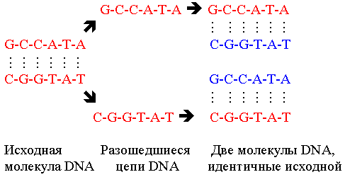 Репликация DNA (воспроизведение генотипа) происходит по полуконсервативному механизму. Каждая нить двойной спирали выступает в роли матрицы для синтеза новой цепи. Следовательно, вновь образованные двухспиральные молекулы состоят из одной Lновой¦ и одной Lстарой¦ цепи.